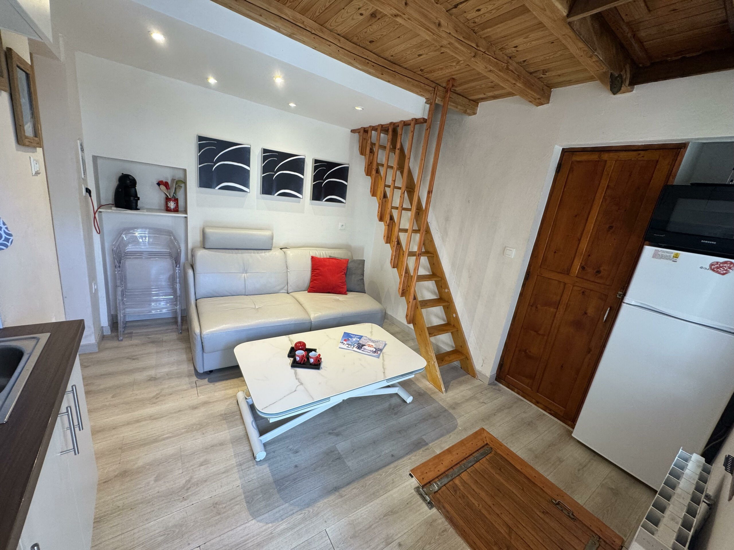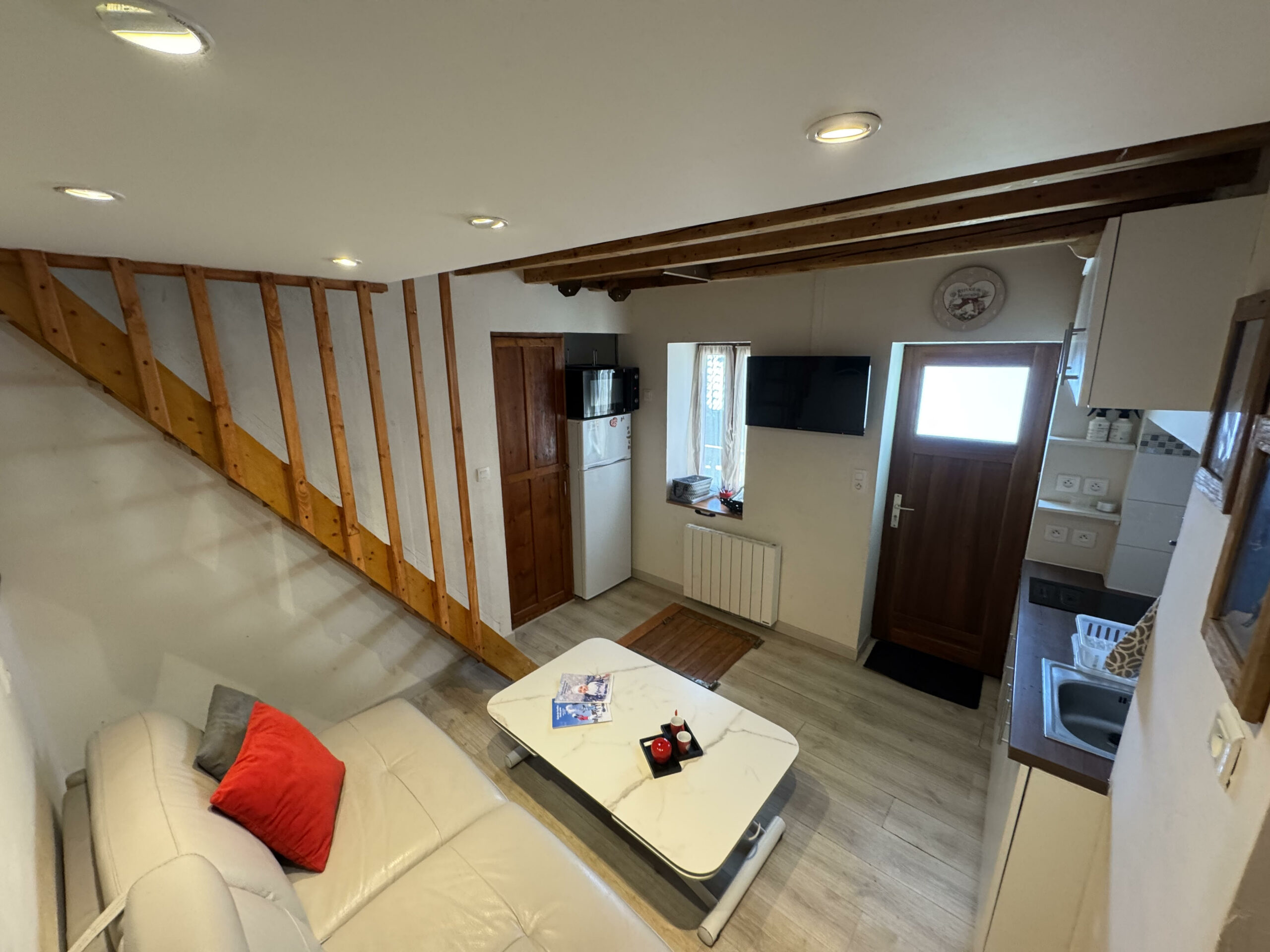 Une pièce de vie avec coin cuisine tout équipé (four, frigo, lave vaisselle, cafetière à dosettes, plaque induction, appareil à raclette, à fondue,…) ; un canapé-lit avec couchage 140×200 et télévision écran plat.